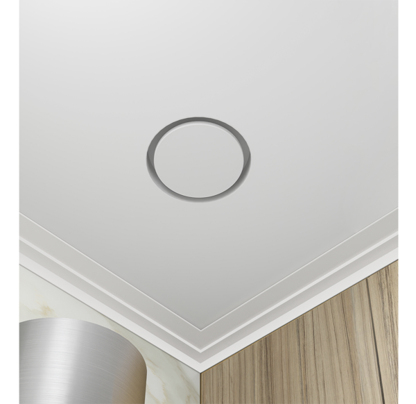 Диффузор монтируется в одной плоскости с натяжным потолком.